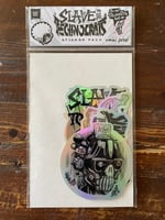Details: 4 large custom holographic stickers with a postcard silkscreen print of "Slave to the Technocrats" released November 2024. Silver medal winner for Illustration at the Summit International Awards 2024.